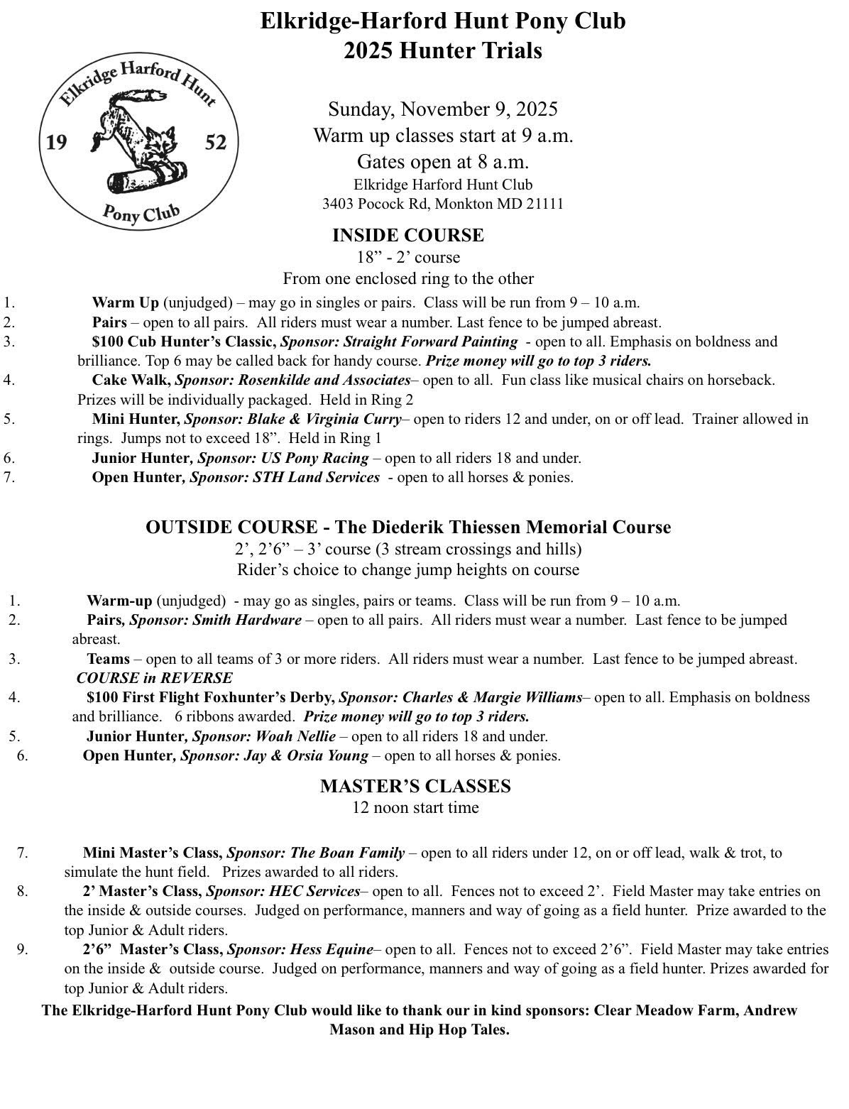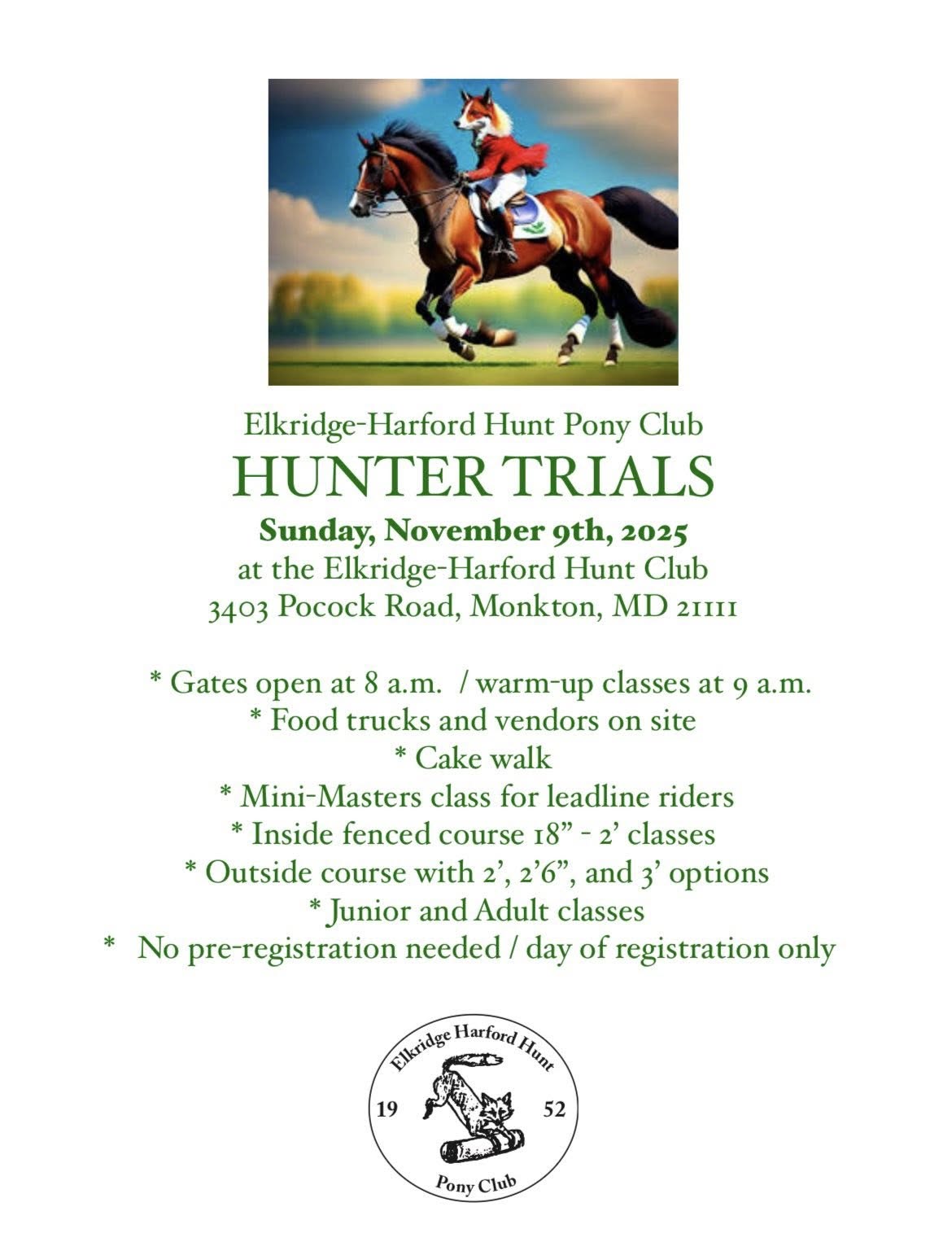 Please join us at 3403 Pocock Road, Monkton, MD, 2111 for the Elkridge Harford Hunt Pony Club Hunter Trials! From 18” inside courses to 3’ cross country jumps, we have a class for everyone. Come enjoy this wonderful community event! Gates open at 8am, warm up classes start at 9am. Food trucks and vendors on site.